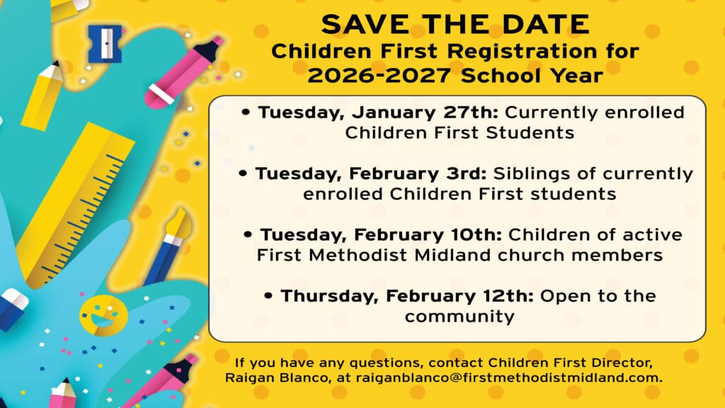 Children First Children’s Day Out and Preschool Program, a ministry of First Methodist Midland, provides a nurturing environment where children learn through play and meaningful interaction. Our program fosters spiritual, social, emotional, physical, and intellectual growth, giving children daily opportunities to explore, discover, and create as they grow as Children of God.