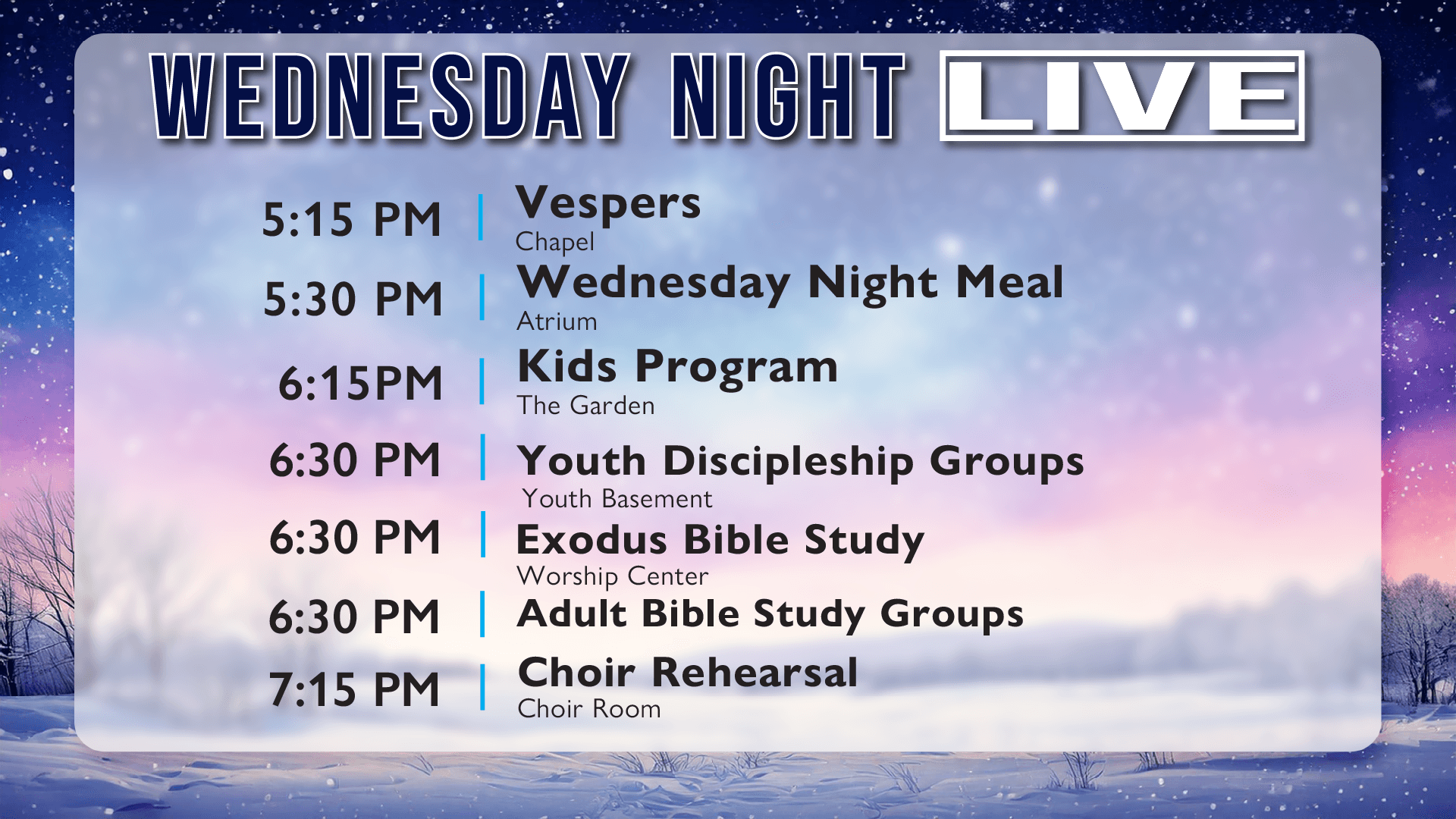 Bible Studies for Adults (6:30 PM, various locations): Choose from several study options, including our Exodus Bible Study in the Worship Center.